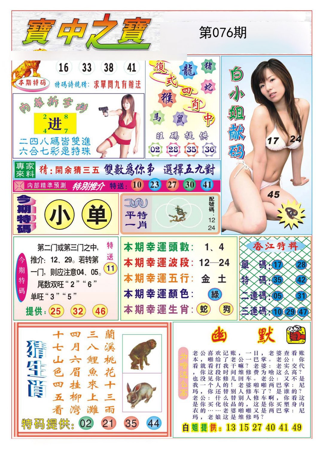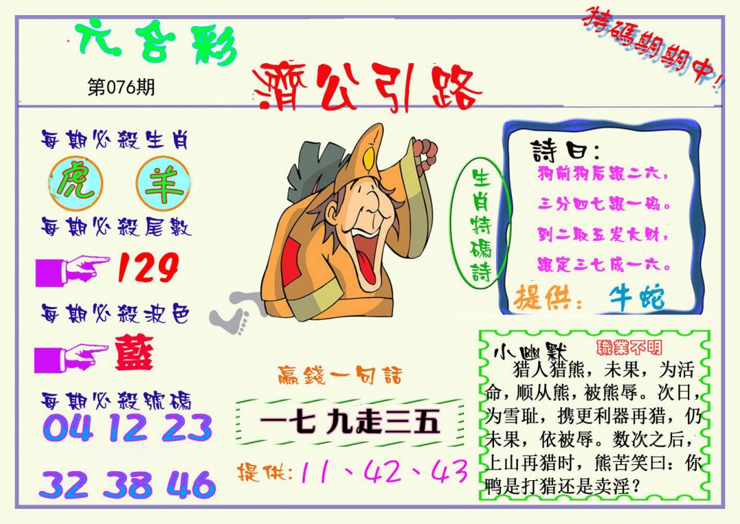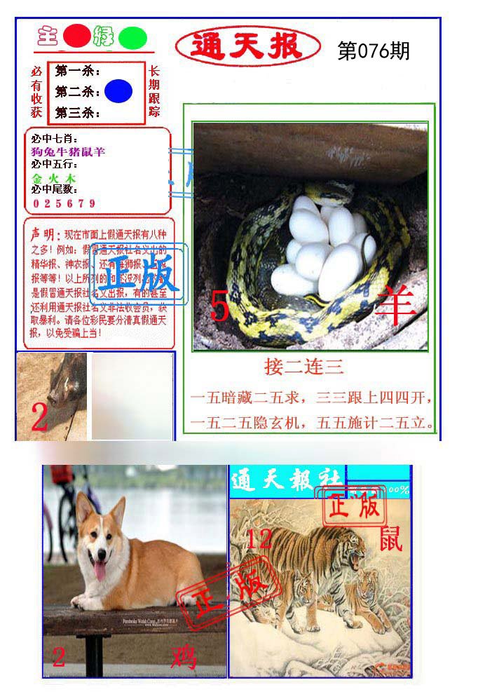 | 076期: 平特一肖 〖蛇 猴 鼠 羊 猪 虎〗 |