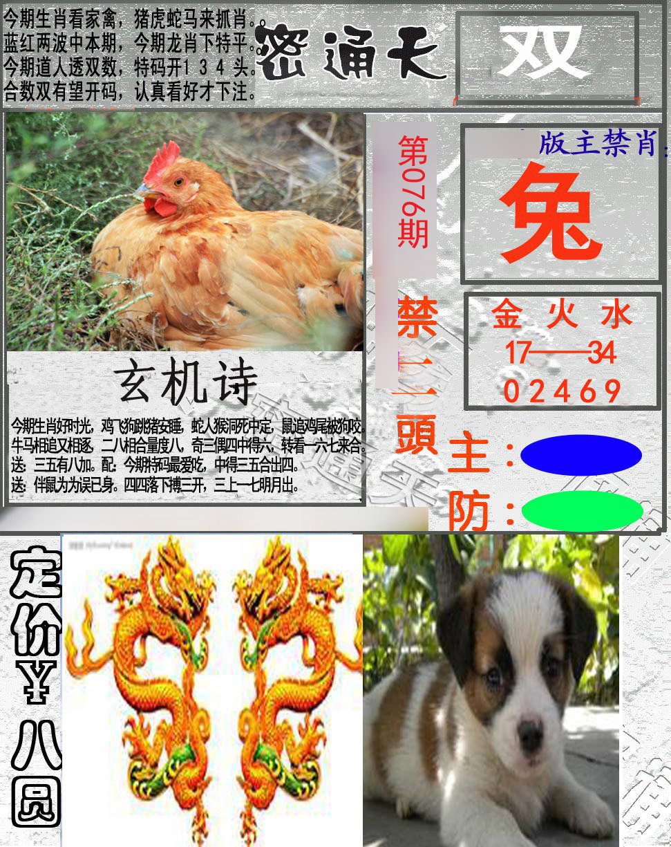 澳门传真074期开 牛30 第074期:今朝唯指此家禽,三字来头七相送,回首三四要留意,玄机中看三九合。江河湖海任我行,死路一条还要走,星辰北半粒粒送,鼠目溜转有怪招. 送:金水火。配:今期生肖二三来,石榴夫人找奴才。(送:一二三头开) 今期生肖出英雄,东征西例打先锋。(送:单数中) 【蓝波+双数】 综合生肖: 鸡牛羊猪蛇狗龙兔 挑码: 14 17 20 09 41 15 24 31 28 06 |